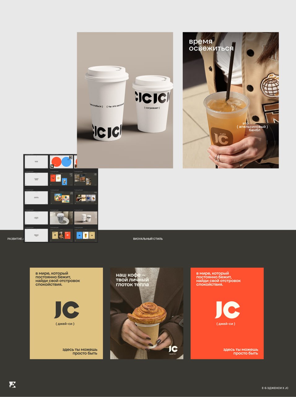 Наконец-то заканчиваем проект по JC (ага, мы уже показывали наработки, но потом была еще парочка итераций в концепцию). Сейчас все готовим к печати, и сеть кофеен получит свой новый брендинг.